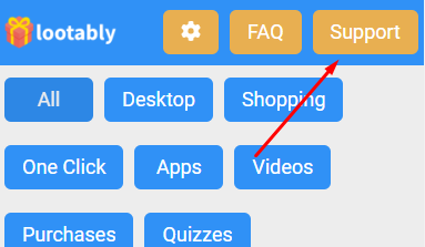 Click on Lootably on your earn points page. As soon as you see the Lootably offer wall, click on "Support" in the top right-hand corner: