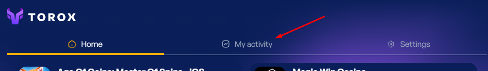 Select Torox on your Earn Points page to enter the Torox Offerwall. Click on "My activity" at the top of the page: