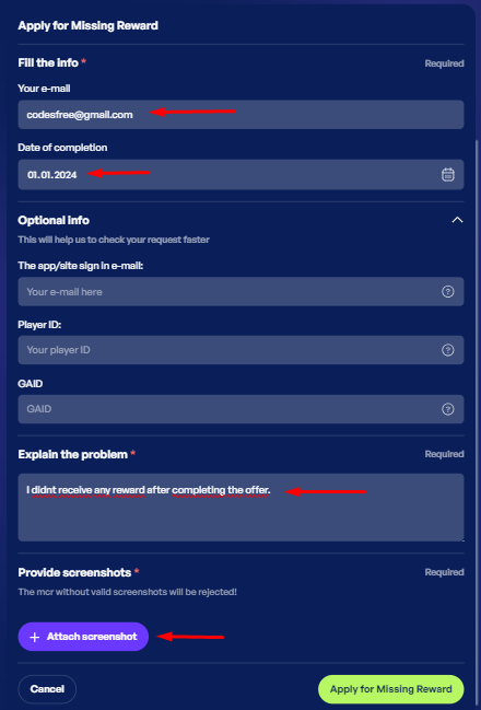Fill in the form that appears. Enter your e-mail address and the date on which you completed the offer. In the "Optional Info" tab, you can enter additional data that will allow Torox to identify your participation: this can be, for example, the e-mail you used for the offer or a user ID/username within the offer (this is not necessarily your CodesFree.net data).